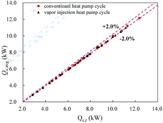 For each described experimental condition, the superheat controlled by the main expansion valve A at evaporator outlet was kept at 5 °C. The expansion valve B was kept fully open to ensure that as much refrigerant liquid as possible flowed into the evaporator. The steady state of the heat pump under each test condition must last at least 30 min, and the average heating capacity Qc,avg and average heating COPavg can be calculated by taking the average values of each parameter in Equations (3) and (4) under 30 min.