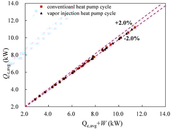The energy balance between the brine side and the refrigerant side is evaluated in Figure 4, and the relatively small deviation of the heating capacities between the brine side and the refrigerant side is less than ±2.0%. The energy balance of the heat pump cycles can be checked in Figure 5 with a small deviation of ±2.0%.