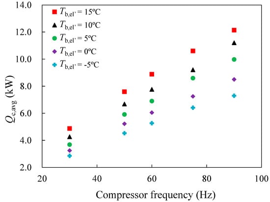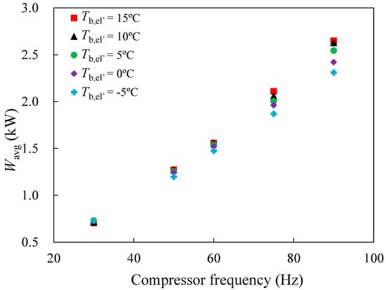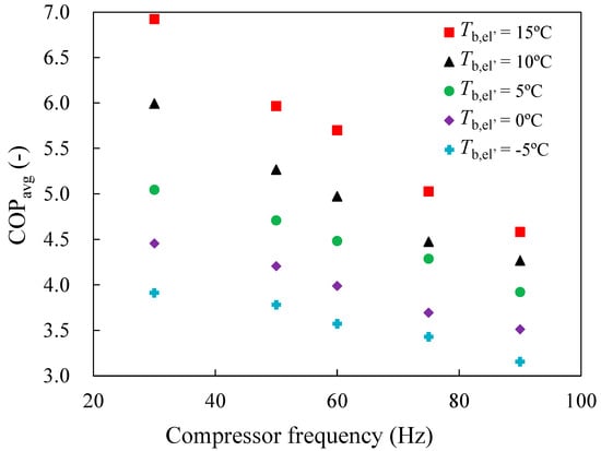 In addition, the heating COPavg decreased more with the compressor frequency when the inlet temperature of the primary fluid Tb,el′ is higher because the power consumption increased more with the compressor frequency when at higher Tb,el′ as shown in Figure 8. The heating COPavg at 90 Hz decreased by 19% compared to that at 30 Hz when Tb,el′ is −5 °C, while the heating COPavg at 90 Hz decreased by 33%.