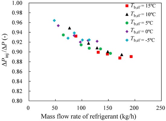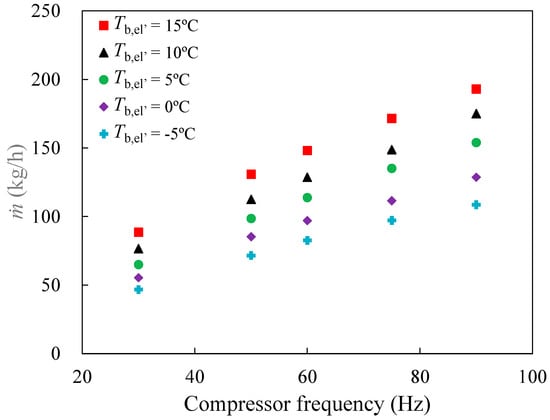Since the inlet temperature of the primary fluid Tb,el′ corresponds to the evaporating pressure, when the evaporating pressure is higher, the heating COPavg is larger, as shown in Figure 6. The heating capacity increases with the evaporating pressure due to the incremental total mass flow rate of the refrigerant (see Figure 9) by sucking vapor with a low specific volume. Moreover, the lowered evaporating pressure induces the higher compression ratio which reduces the compression efficiency of compressor. Therefore, the heating COPavg is reduced when Tb,el′ is decreased.