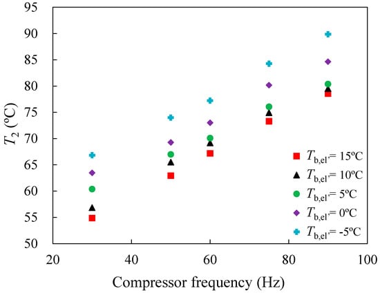 The compressor discharge temperature T2 as a function of compressor frequency.
