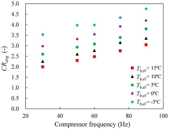 Figure 10 and Figure 11 show the compressor discharge temperature and compression ratio when the compressor is operated at different frequencies. The compressor discharge temperature and the compression ratio increased continually with the compressor frequency, with the same trend approximately. The increment of the compression ratio can be used to interpret the increase tendency of the power consumption of the compressor with the compressor frequency. The increasing compression ratio is the main reason for the decrease of heating capacity and increment of discharge temperature of compressor at low Tb,el′. When the heat pump is operated in an extremely cold region, the high discharge temperature would exceed the maximum discharge temperature of the single-stage compressor, and the heating capacity will decrease more significantly. Therefore, the adoption of vapor injection techniques is motivated to decrease the compressor discharge temperature and enhance the heating performance.