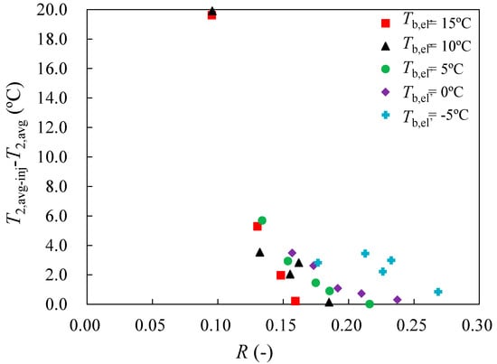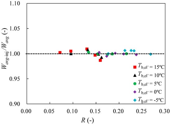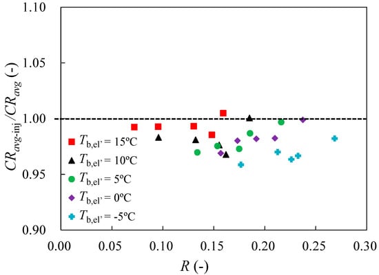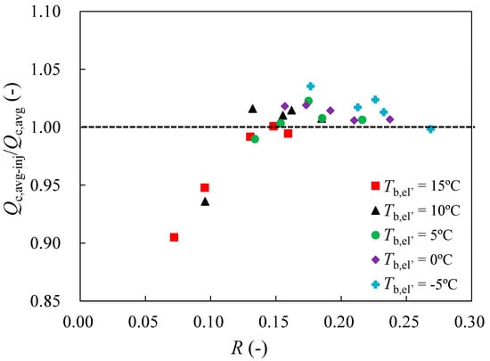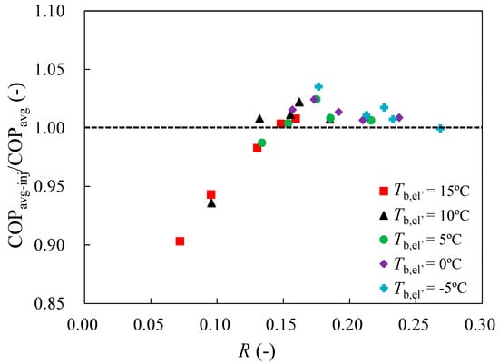 The tendency of the normalized heating capacity Qc,avg-inj/Qc,avg and the normalized heating COPavg-inj/COPavg as shown in Figure 12 was similar. The heat pump cycle with vapor injection in this study is likely to be slightly effective to increase the heating capacity Qc of the heat pump system when the injection ratio R falls into the range of 0.16–0.17.