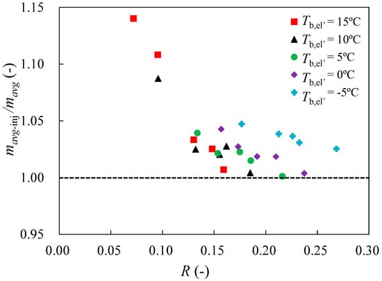 The normalized mass flow rate of the refrigerant avg-inj/avg with the injection ratio R in the vapor injection heat pump cycle.