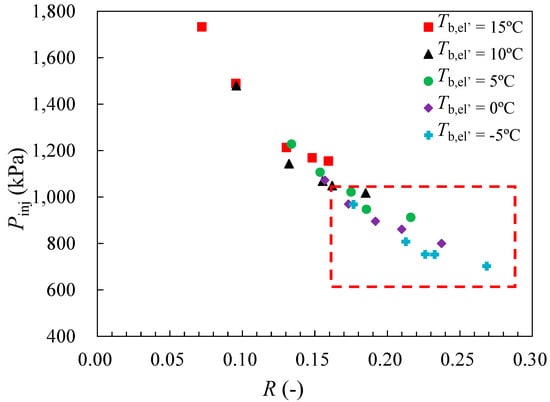 The injection pressure Pinj with the change of injection ratio R in the vapor injection heat pump cycle.