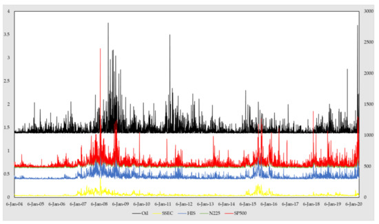 The data selected in this paper are from the period January 4, 2004 to April 6, 2020. The main reasons are as follows. First, on September 22, 2003, the Chicago Board Options Exchange (CBOE) revised the Volatility Index (VIX) to change the target selection from Standard & Poor’s 100 (S&P 100) to S&P 500, and it changed the series of call options and put options closest to the evaluation to all series so as to provide market participants with an emotional indicator that could better reflect the overall trend of the market through a broader range of underlying assets, with data disclosure starting in 2004. According to its implementation period, the crude oil and stock index data in this paper have very strong comparability from January 4, 2004 to April 6, 2020. Second, the trading days of financial products in different markets are not synchronized due to different holidays; in order to maintain the consistency of data time, we exclude the relevant data with missing value dates.