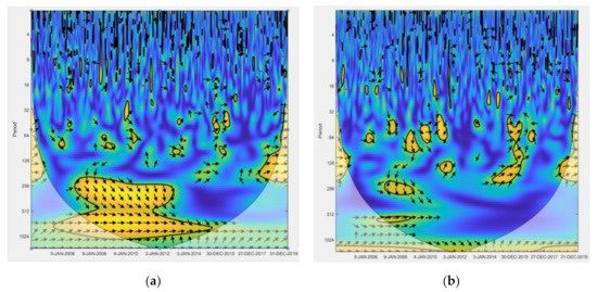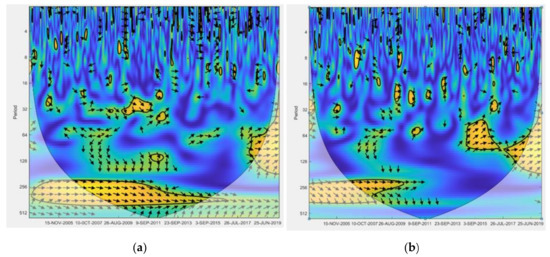 In Equation (5), the parameters and give the virtual part and the real part of the smooth power spectrum respectively. In a time-scale wavelet coherence map, the phase difference is usually represented by a direction arrow. If the sequence is positively correlated, the arrow points to the right; if the sequence is negatively correlated, the arrow points to the left. If the arrow points up, crude oil price volatility is ahead of stock market index volatility; otherwise, it points down.