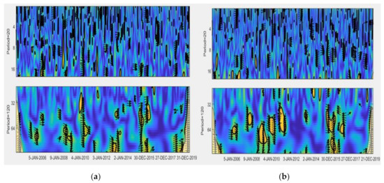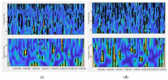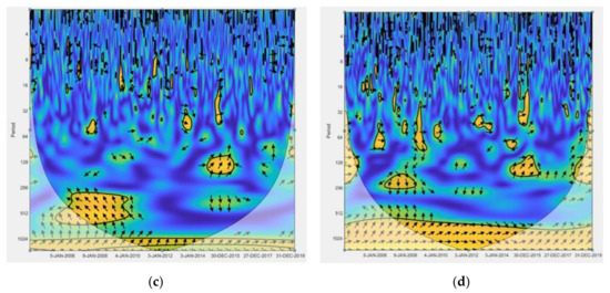 As the impact of institutional time and other factors in different countries may affect the behavior of investors in the stock market, it is also necessary to explore whether there are differences between the long-term effect and the short-term effect [37,38,39]. Masih and Masih [29] studied the dynamic causality among international stock price indexes, and they believed that there was a significant interdependence between the Organization for Economic Cooperation and Development (OECD) and Asian markets as well as the leadership of the US and UK markets in the short and long term. Bao et al. [40] applied a deep learning method to financial research and introduced long-term and short-term memory models to predict stock price. Engle et al. [41] explored the relationship between stock market volatility and macroeconomic activity and distinguished short-term and long-term movements with the new class of component models, finding that macro fundamentals also play an important role in stock price trend in the short term. Generally speaking, in the stock market, the long term refers to 6 months or more, the medium term refers to 1 month to 6 months, and the short term generally refers to less than 1 month. In the stock market, long-term operation involves investment in enterprises, while medium and short-term operation involves investment in the market. Different shareholders will choose according to their own situation suitable for their own operation mode. However, generally speaking, the risks in the stock market tend not to be long-term. In addition to the period of financial crisis, the risks spread in the global financial market, and the crude oil market is also affected, so long-term investment of more than six months is not considered here. Therefore, in this paper, we study crude oil as a hedging asset and enlarge the wavelet coherence diagrams of the crude oil market and the stock market according to different periods, taking 20 trading days (one month) as the boundary, periods 20 days as short-term and 20 period 120 as long-term.