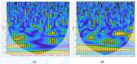 Compared with the long term, the correlation between crude oil and the stock market is lower in the short term, and the hedging ability is stronger. In Figure 3, no matter which country’s stock market, in the short term, the wavelet coherence graph is covered by cold colors, while in the long run, there are more right-pointing arrows, and the stock market is positively correlated to fluctuation of the crude oil price. In the short run, crude oil is suitable as a hedging asset in the stock market. In cross-border investment activities, market investors are more sensitive to stock market volatility caused by domestic policies and carry out arbitrage. Because the financial markets of the United States, Japan, mainland China and Hong Kong are rich in financial derivatives, investors can use different combinations of instruments to hedge risks when the stock market volatility increases, and the tolerance of stock volatility is greater. In the long run, from August 2008 to January 2011 and from August 2015 to June 2016, the phase between crude oil and stock markets of various countries points to the upper right, showing strong correlation. The main reason lies in the contagion effect of global economic and political events in various financial markets. From August 2008 to January 2011, during the financial crisis, the sub-prime mortgage crisis in the United States, along with the relationship between banks through asset prices, liquidity and other channels, has formed a domino effect, bringing huge risk exposure to the global financial and derivative markets, and crude oil with financial attributes has also been affected. During the period from August 2015 to June 2016, Organization of Petroleum Exporting Countries’ s (OPEC) insistence on not reducing production triggered a wave of oil price decline, as the organization gave up the production ceiling and OPEC production continued to rise as Iran returned to the crude oil market. The huge fluctuation of the crude oil market had the same impact on the global financial market. The positive correlation between crude oil and China’s stock market shows that the long-term trend in both is influenced by the global economic background and has convergence factors. The price fluctuation of the crude oil market is determined by its own internal factors and by external factors of global risk, so the correlation is strong.