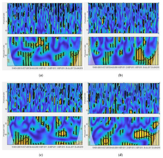 The co-movement between the oil and stock markets in the time-frequency space in the context of panic. (a) US stock market, SP500; (b) Japanese stock market, N225; (c) mainland China’s stock market, SSEC; (d) Hong Kong stock market, HSI.