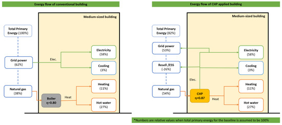 Comparison of energy flow in building without/with combined heating and power. Source: based on [11].