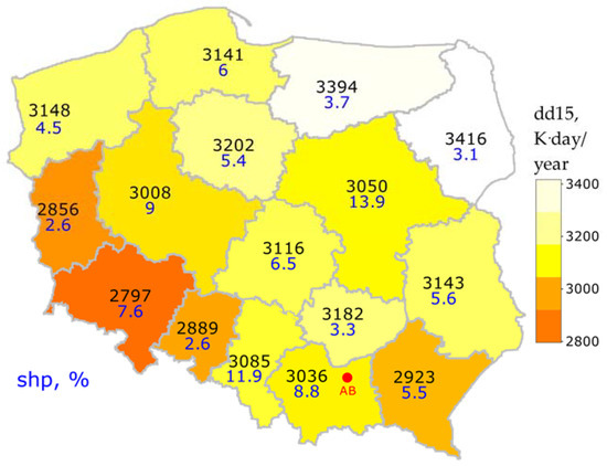 Map of Poland with degree–day values for each voivodship (color scale: dd15, black color) and the percentage share of the number of households in the voivodship in relation to the total for the whole country (shp—blue color). The location of the analyzed building is also marked (AB).