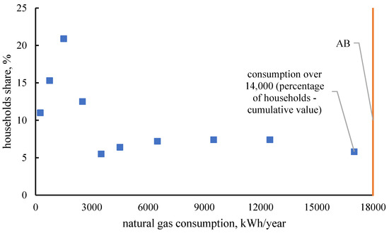 In the analyzed building, electricity consumption in 2018 amounted to 5590 kWh, which places the house in 5% of households with the highest energy consumption in Poland (Figure 5) [1]. However, when analyzing the number of inhabitants living in the house (average annual: 4.5 people) taking into account the average electricity consumption per resident of rural areas in 2018, which is 1088 kWh/year, the analyzed building is close to the average. Similarly, the building is located in terms of natural gas consumption, also in the highest group—Figure 6, but in this case it is also influenced by the fact that 21.8% of rural households in Poland in 2018 consumed natural gas and only 1.7% was equipped with a single-function gas boiler (as in the case of analyzed building). Generally, natural gas was used in 55.7% of households in Poland, but more than half of the recipients (51.9%) used it only for cooking meals (often with access to heat network), of which 14.0% for apartments heating.