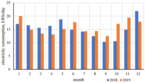 In addition to data nationwide, a real object was selected for analysis—a building that in 2018 and 2019 was inhabited by an average of 4.5 people, one of whom was retired. The consumption of electricity was primarily influenced by the use of electricity to prepare meals: electric induction hob and water boiling. The building’s thermal needs were met by a single-function gas condensing boiler integrated with a domestic hot water buffer tank. In the summer, the basic source of energy needed to prepare hot water was a solar system (3 flat collectors). The consumption of electricity and natural gas in the individual months of 2018 and 2019 are shown in Figure 7 as the average daily consumption. In winter months higher energy consumption than in summer can be noticed. It is related to the operation of the central heating installation (auxiliary energy) with greater lighting needs. In turn, in the summer months the use of air conditioning in two rooms was important.