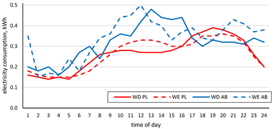 Average daily electricity load profile: WD PL—weekdays Poland, WE PL—weekend Poland, AB—analyzed building. Source: own study based on [59].