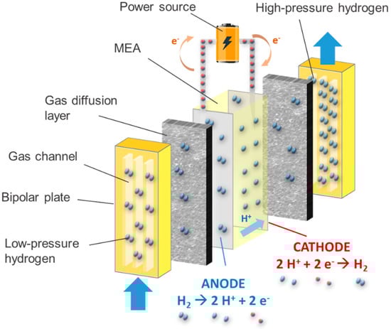- Grigoriev, S.A.; Shtatniy, I.G.; Millet, P.; Porembsky, V.I.; Fateev, V.N. Description and characterization of an electrochemical hydrogen compressor/concentrator based on solid polymer electrolyte technology. Int. J. Hydrog. Energy 2011, 36, 4148–4155. [Google Scholar] [CrossRef]