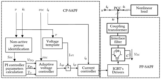 The control system of an SAPF contains an external control loop for the DC-capacitor voltage and an internal control loop for the compensating current [1,12,14,15]. A way to increase the performance of the active filtering system is the synthesis and implementation of new control algorithms, which are simple to implement and allow for high sampling frequencies. The literature illustrates the implementation of adaptive controllers [11,14,16], sliding mode [17,18,19,20,21,22,23], fuzzy [24], or combining these techniques with each other, or with neural techniques [25,26,27,28,29], both in regulating the DC-capacitor voltage and compensation current.