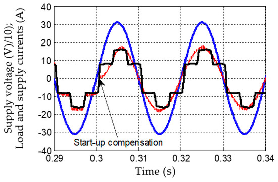Figure 26a,b confirm the good dynamic behavior of the active filtering system at the beginning of the compensation and when the load decreases, respectively increases. It is shown that the DC-capacitor voltage adapts to the new value of the apparent power to be compensated and that the supply current is almost sinusoidal, except for the transient regime. Figure 26a illustrates the evolution of the DC-capacitor voltage and supply current in the dynamic regimes of the start-up compensation at nominal load (SN) and when the load decreases from SN to 0.5SN. It shows that there is an overshoot of the voltage and that the new value of DC voltage is obtained in accordance with the adaptive algorithm. After the start-up of the compensation, the supply current becomes sinusoidal after about 5 ms, and its magnitude becomes constant after about 50 ms. When the load decreases, the transient regime of the supply current ends after about 50 ms. In the case of load increase, the voltage overshoot is smaller and the duration of transient regime is smaller too, of about 40 ms (Figure 26b). After the transient regime is completed, the value of DC voltage corresponds to the nominal load.