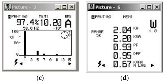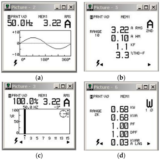 Experimental results for the adaptive control at reduced load on the load side, in steady state regime, provided by Fluke 41B analyzer: (a) waveform of the load current; (b) RMS value and load current THD; (c) harmonic spectrum of the load current; (d) powers per phase and power factor.