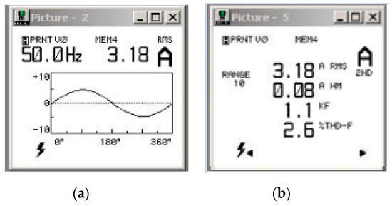 The total harmonic distortion factor of the current was calculated according to the total rms value (I) and the rms value of the fundamental component (I1), according to the expression [53]: