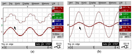 Oscillograms for the adaptive control at nominal load in steady state regime: (a) load current and supply current after compensation; (b) phase voltage and current after compensation.