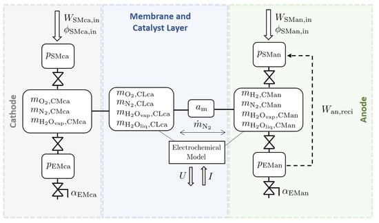 where  denotes the linear nozzle coefficient and  the pressure difference with respect to the previous volume . The linear nozzle flow Equation (4) can be readily exchanged with the nonlinear nozzle equation [] to differentiate between choked and non-choked flow conditions. However, owing to the already existing model simplifications, and adhering to a parsimonious modeling principle, the linear flow equations are used in this work. Furthermore, it is assumed that the mass fractions of the in-flowing species  are given by the mass fractions of species in the previous manifold. Also due to consistency, it follows that . Note that for the catalyst layer manifold . This corresponds to the assumption that the flow from center manifold to the catalyst layer is governed by diffusion and convective mass transport through the GDL is neglected [,]. The supply manifold in-flows  can be calculated from the (measured) overall mass flows  and the relative humidities . The actuation of the back-pressure valve on cathode and purge valve on the anode are described by a time-varying nozzle coefficient