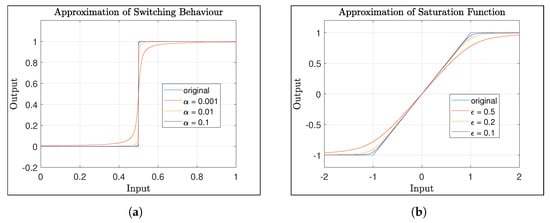where  is again a scalar tuning factor. In Figure 3, the switching and saturation function and its smooth approximations for different values of the tuning factors can be seen.