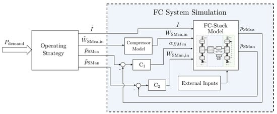 The paradigm shift in the global energy economy towards sustainable and renewable alternatives has led to an increase in academic and industrial fuel cell activities. The development of fuel cell systems has surpassed the prototype phase as several OEMs already offer fuel cell (FC) vehicles in small series. With the increase of the technological readiness, the requirements imposed on the fuel cell system are becoming more and more stringent. To increase the market penetration and competitiveness, specific costs need to be reduced while durability and efficiency have to be increased []. These requirements lead to conflicting goals. For example, it is desired to reduce the capacity of the auxiliary battery, in order to save costs. However, this leads to a more direct and dynamic exposure of the fuel cell system to transient power demands. During these transients, several internal states should be maintained within defined limits so as to prevent the onset of critical operating conditions such as oxygen or hydrogen starvation, excessive membrane humidity cycles, flooding and dry-out [,], imposing a significant challenge on any control scheme. This is further aggravated by the fact that the critical internal states of the fuel cell stack cannot be measured directly, or it is just not economically reasonable to do so. To meet these challenging and possibly conflicting goals (i.e., an efficient operation is not necessarily fault tolerant or life-preserving), advanced model-based analysis, diagnostics and control methods [,,] are becoming indispensable.