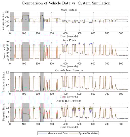 In this section, the accuracy of the fuel cell system simulation is analyzed and evaluated. During the operation of the research vehicle on the test circuit, the set-point values for the fuel cell system, which are determined by the operating strategy, were recorded. These set-point values are used as an input to the fuel cell system simulation. The resulting simulation output is then compared to available measurements in the vehicle.