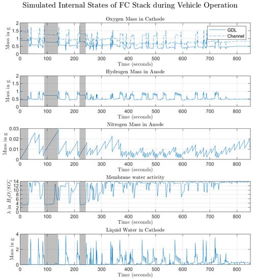 In Figure 6, some of the simulated internal states of the fuel cell during the transient operation can be seen. The first two plots show the transient change of oxygen and hydrogen mass in the cathode (Channel and GDL) and anode during the drive cycle. Such real-time signals during operation are an invaluable source of diagnostic information as to prevent fuel starvation. Note that the detection and prevention of fuel starvation is frequently indicated by the stoichiometric ratio []. However, under dynamic operating conditions the description using the stoichiometric ratio is somewhat inadequate. For example when determining the stoichiometric ratio for oxygen, the mass flux needed for reaction can be related to the inflow of oxygen into the stack, which is typically measured by a mass flow sensor located between the compressor and the cathode inlet. Under steady state conditions, it is obvious that starvation occurs when the inflowing amount of species is less than the amount required for reaction. However, during transient operation, the use of the stoichiometric ratio, as determined by the amount of inflowing species, may lead to false conclusions, as the internally stored (compressed) oxygen in the cathode and its dynamics and transport processes are thereby completely neglected. The third plot in Figure 6 shows the accumulation of nitrogen in the anode and its rapid discharge due to purging. A coulomb-counting purging strategy was implemented to actuate the purge valve. As hydrogen is ejected during purging, minimum purge action would be desired as to increase the efficiency of the system. With a real-time estimate of the accumulated nitrogen, a threshold purging strategy can be implemented.