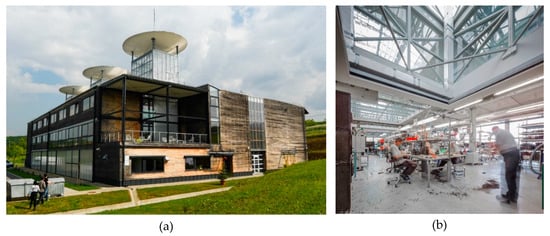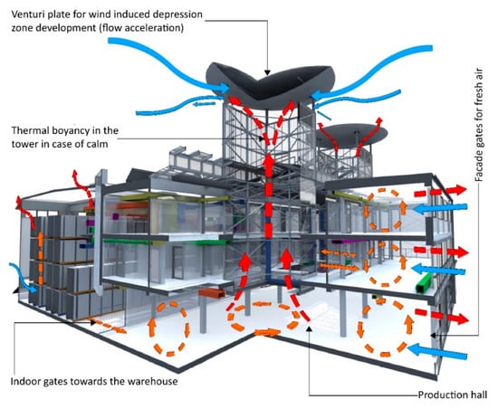 (a) Experimental reference industry and office building (RATI Ltd.) with passive ventilation towers and wind accelerator ‘Venturi’ deflectors; (b) production hall with adjacent ventilation chimney opening.