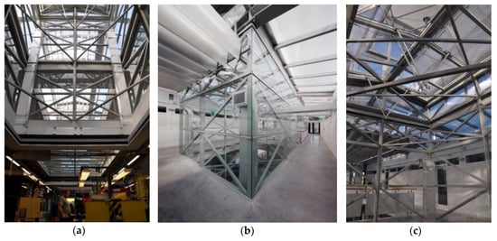 The passive air conduction system (PACS) in the implemented building. (a) Steel–glass–polycarbonate tower with bottom opening above the production hall; (b) central atrium penetrated by a tower; (c) upper tower opening with 60% intensity.