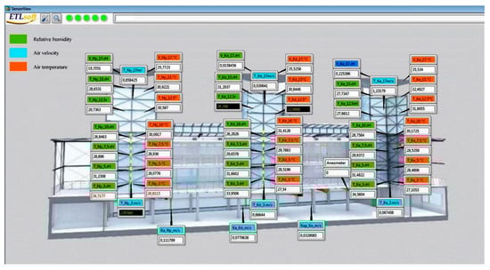Software interface screen of the MMS monitoring system. Air temperature and relative humidity at different heights of the towers, airflow velocity at 3.5 and 17.0 m height of the towers, airflow velocity in the production hall and at façade gates.