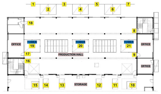 As part of a research collaboration between the owner and operator RATI Ltd. and the University of Pécs (PTE), the university has added a complex mobile monitoring system (MMS) to the existing building management system (BMS) in the pilot building. The BMS provides users with the ability to control general building automation which contains 300 sensors. The second system, the MMS, includes more than 750 data points and allows the research group to collect flow data from the PACS, energy-related data from the heating, ventilation and air conditioning (HVAC) system, and indoor environment comfort quality (IECQ) in the different rooms. The physical characteristics of the building have been monitored by the research team between the period 2015–2020. The measurement of the thermal and flow conditions of the production hall is crucial for this study, in order to calibrate the CFD simulation model and the comfort and energy system modeling for further research investigations. In the framework of continuous data collection, air velocity measurement was carried out with Dantec Comfort Sense Mini CTA (constant temperature anemometer) hot wire probes (which can measure velocities between 0.05 and 30 m/s with accuracy of 2% between 0.05 and 1.0 m/s and 5% between 1.0 and 5.0 m/s, respectively); the air temperature was measured with TESTO 6621 sensors, with the accuracy of 0.5 °C in temperature. Figure 4 shows the built-in, continuous measurements in the PACS. At a height of 3.0, 5.0 or 7.5, 10, 12.5, and 17.0 m, the towers are equipped with air temperature and relative humidity measuring sensors to record temperature gradients, heat flows, etc. Additionally, in each tower, two CTA probes were installed, the lower one at hall height (at 3.5 m) and another one at the chimneys’ top height (at 17 m).