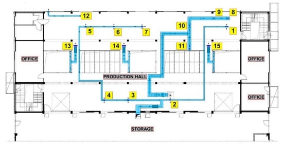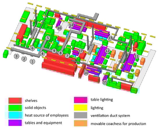 A highly detailed 3D-model has been built; every single furniture is placed in the hall, mostly in simplified representation as a cuboid. The model contains heat sources as well: all lamps and instruments and their heat losses and people’s heat dissipation (Figure 8 and Table 3). For each obstacle that possesses certain internal heat gain with different heat intensities (W/m3) were dedicated corresponding to the automated and manual monitoring in the production hall. The heat source values are contained in Table 3 for the machines and the worktables.