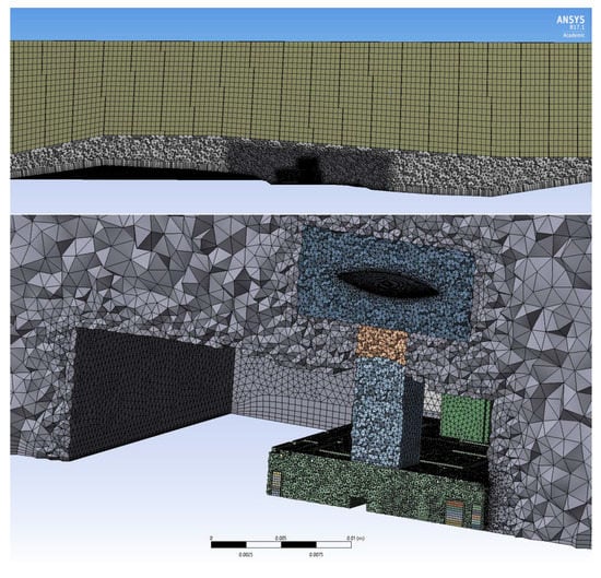 The geometrical discretization has been followed by dividing the flow field for numerous cell size domains to have accurate values where it is needed, and the model size was fitted to the computation limits with almost 9.5 million cells in volume. The most detailed is the production hall; the remaining inner rooms and spaces are not important for the research questions (Figure 9). Different leaks were constructed around the façade gates (as an effect of the inaccurate construction), having adjustable porosity properties in order to simulate the infiltration phenomena through the façade [40]. According to boundary conditions assessment (manual measurements), the air duct system’s supply air inlet volume flows were modeled as well. The discretized geometry consists of 0.2 m average cell size elements inside the building. The external space was divided to diverse volume domains, where the average cell size in the near building shell domain is 1.5 m, while the ground holds a 5 layers of prismatic boundary layer for the proper modelling of the important near wall flows, thus the volume mesh is an unstructured hybrid mesh with pyramid, tetra and hexagonal elements.