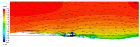 Figure 11 shows the cross section of the model (terrain and building) with the developed air flow around the building as an overview of the flow field. The initial comparison for the validation was derived from the average velocity magnitude in the cross section at the wind velocity meter (Figure 12, left). The results show 0.16 % of deviation compared to measured data, which can be accepted as an accurate result [6]. As the second reference, the air temperature differences were highlighted (Figure 12, right), and in accordance with the results, the energy transfer simulation method can be stated as acceptable, with no need for further statistical analysis, while the difference from the measured values shows a value lower than 1%. In an engineering application, this result can be used for further joint processes.