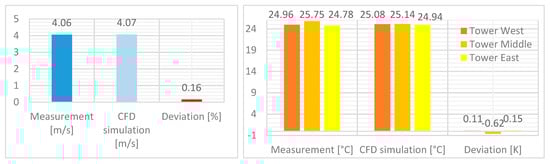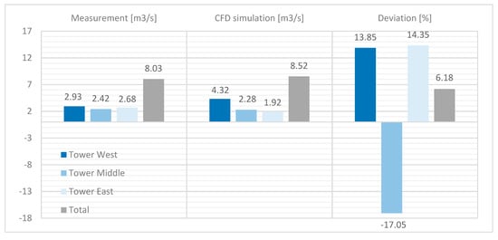 Next, the ventilation of air volume flow rate was analyzed at the three towers (Figure 15). Regarding the total volume flow rates, a disagreement of 6.18% occurs. The detailed comparison at each tower’s airflow characteristic delivers higher deviation between 13–17% in both positive and negative directions due to the following correlations. In the simulations a constant wind flow is provided form NW direction; according to that, a constant airflow system can be developed in the model. Since the wind direction changes continuously, there is no constant wind direction in reality, so the wind direction can change even every minute. To avoid this problem, only wind direction data were taken into account between north and west. In case of a rapid wind direction change from north to west, airflow acceleration will be induced in the wind exposed west tower. During this, in the east tower—which is located now in slipstream—the airflow stops not immediately, but rather continues according to the previous N wind’s momentum to stream forward in the moment of measurement. This air movement does not change the measurement values significantly but shows the appropriate distribution as lightly distorted.