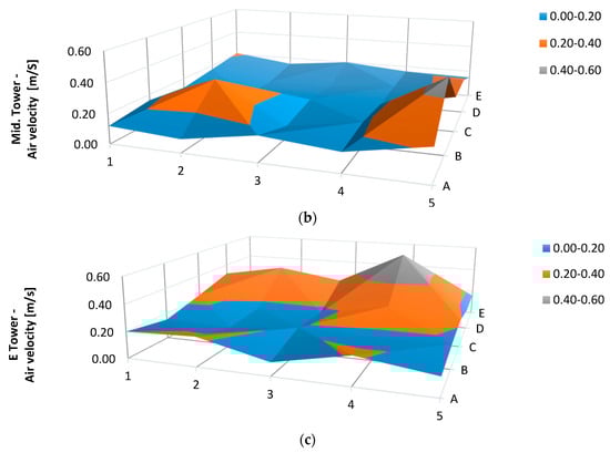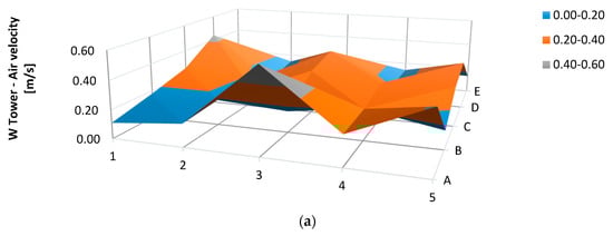Manual measurement results in 25 sampling points per each tower about air velocity in the bottom inlets in 3 m height.