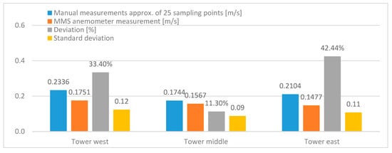 Comparison of hand measurement results in 25 sampling points per each tower (mean value) and MMS automated anemometer measurement of 1 sampling point about air velocity in the towers’ bottom inlets.