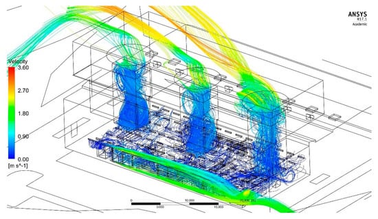 Airflow characteristic in the production hall with three updraft ventilation towers, velocity pathlines (m/s)—validated CFD model of the implemented Hungarian reference building (Supplementary Materials).