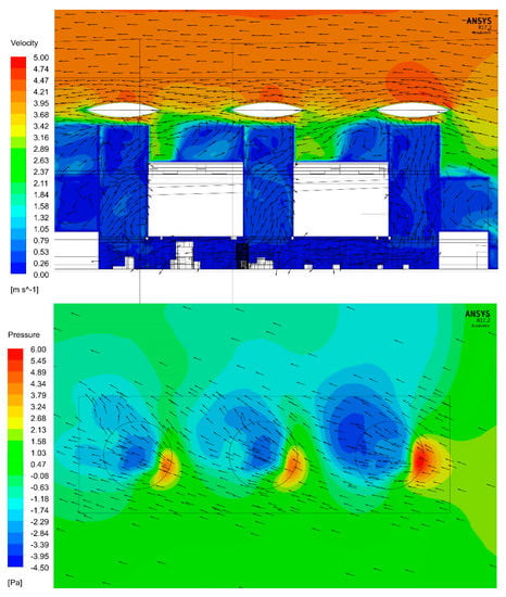 At the initial wind direction, we can follow the tower efficiency by monitoring the pressure field at Figure 17 (bottom) demonstrating decreasing efficiency in this specific wind direction. Figure 17 (top) shows the decelerating velocities in the chimneys moving from right to left, while the pressure diagram (Figure 17 bottom) shows that the suction power of the depression zone behind the towers is gradually decreasing, following the wind direction. In this case, when the wind approaches the building parallel to the longitudinal axis of the hall, the towers have a slipstream-effect on each other; therefore, the towers behind each other possess less suction power. Consequently, the ‘ideal’ wind direction means currents perpendicular to the longitudinal axis of the building, i.e., wind direction from N. In this wind direction case, no slipstream situation would evolve, and hence the efficiency would increase, resulting in a better ACH in the production hall.
