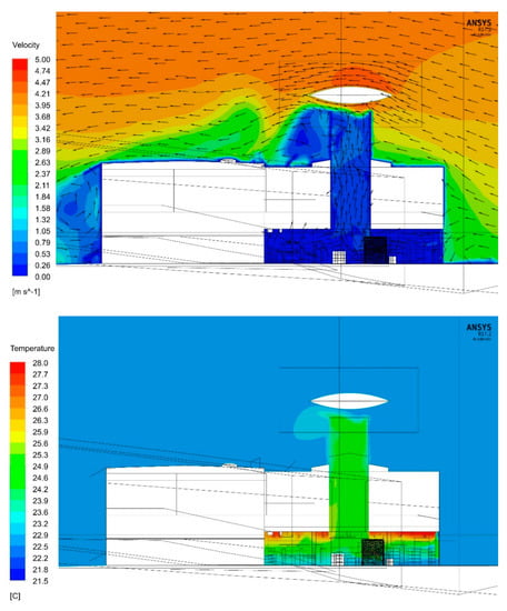 Figure 18 shows the internal conditions of the production hall. According to the figure on the top, there is no draft inside the hall, to the detriment of the PMV-index and to the benefit of the DR-index according to EN ISO 7730 and EN 15251; only the exhaust air inside the chimney starts to accelerate. There is an efficient wind acceleration effect to observe: the wind velocity of approx. 2.5 m/s is accelerated to approximately 5 m/s between the chimney’s top opening and the ‘Venturi’ disc by developing here a depression zone (Figure 17 and Figure 18). Further, the wind strikes perpendicular to the right outer wall of the tower, slows down in vertical direction (from 4.06 to 2.4 m/s) and, as a weakening force, it decelerates the unobstructed higher, horizontal currents. Underneath the ‘Venturi’ plate, below the occurring velocity maximum, there is a small air drop into the chimney, suggesting that the draft booster geometry is far from the chimney opening. The figure at the bottom illustrates that the flow of cooler outside air inside the hall prevents overheating in the comfort zone (indoor space from 0 to approximately 2 m height) due to the heat generated by occupants, artificial lighting, and the equipment. While the air temperature in the comfort zone remains below 26 °C, the overheated area with 26–28 °C is only visible in the red-stained air layer below the ceiling, between 3.0–3.4 m height.