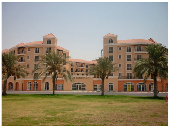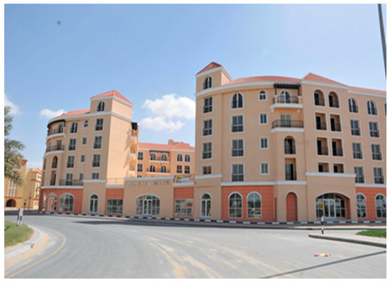 Most occupied LEED-certified buildings in 2014 were in ‘Dubai International City’, from which four LEED-certified multi-residential buildings were recruited (Figure 2, Figure 3, Figure 4 and Figure 5). The key specifications of these buildings are provided in Table 1. PR I and PR II were completed in March 2011 and LEED certified in June and October 2011, respectively. TC was completed in July 2011 and certified in August 2012, and HDS SS II was completed in September 2012 and certified in September 2013. Out of the 628 units of the four LEED-certified buildings, there were 265 occupied units at the time of the survey. Therefore, the questionnaire was distributed to a total of 265 occupants residing in those units (flats/apartments). If more than 154 occupants out of 265 had not participated, then the researchers would have had to target more residential units to reach the minimum acceptable threshold (True Sample). A total of 203 occupants responded to the survey with valid answers, resulting in a response rate of 76.6%. Although the response rate is good, the authors acknowledge that their sample is limited to Dubai residents only, which might have incurred bias in terms of environmental concerns, age, etc. Therefore, future research is recommended, using datasets from a wide range of demographics and geographical regions.