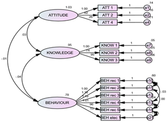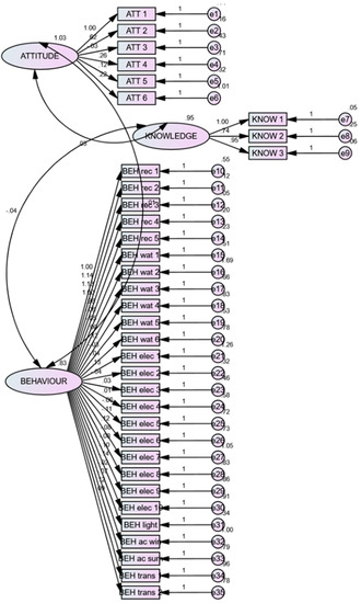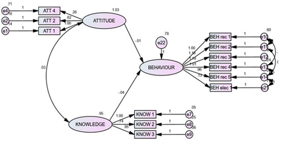 The six questions under the attitude-related survey questionnaire were chosen as observed variables by the authors for ATTITUDE, twenty-six questions were included for the behaviour-related survey questionnaire as observed variables for BEHAVIOUR, and three questions related to the provided information and guidelines were chosen for KNOWLEDGE.
