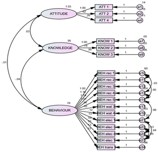 The conceptual (hypothesized) measurement model generated in AMOS is presented in Figure 6. The model shows the interrelationships among the latent/unobserved variables (AKB) and their indicators/observed variables (questionnaire data) for the purpose of assessing goodness of fit and/or validity. The unobserved/latent variable is linked to an observed variable, in order to make its measurement possible. Assessment of ‘ATTITUDE’ (ATT) constitutes the direct measurement of six observed variables obtained through the questionnaire survey; similarly, ‘BEHAVIOUR’ (BEH) is measured through 26 variables (based on recycling, water use, electricity use, lighting use, summer/winter use and transport) and ‘KNOWLEDGE’ (KNOW) is measured through three observed variables. Further analysis was performed through SEM in AMOS, and was categorised and coded as given below: