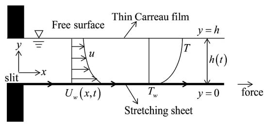 The discovery of the boundary layer by Prandtl [1] remarked the highest achievement in the development of fluid mechanics and created a proper basis to understand the dynamics of the real fluid. The Prandtl boundary layer is found in a wide range of aerodynamics and engineering applications. The boundary layer idea then evolved into the theoretical works on the boundary layer flow over a stretching surface which was contributed by the following literature: Sakiadis [2,3], Crane [4], and Carragher and Crane [5]. These works were highly appreciated due to its significance in the extrusion process. As time progressed, the boundary layer flow has been probed under various circumstances to improve the quality of the extrusion process, and hence many works have been reported accordingly (see [6,7,8,9,10,11,12,13,14,15,16,17,18,19]). Cast film extrusion is an emerging industrial process that produces cast films which are widely used for food and textiles packaging and coating substrates in the extrusion coating process [20]. The demand for this process is still high, and research activities are conducted so that it can be improved from time to time. The theoretical work in thin film flow was started by Wang [21] by investigating the behavior of thin liquid film flow past an impermeable stretching surface and it was found that the similarity solutions were absent when the value of the unsteadiness parameter falls within the range of . Usha and Sridharan [22] reexamined the work of [21] by considering the asymmetric flow and justified that the similarity solutions become unavailable when the value of the unsteadiness parameter fell within the range of . Shortly thereafter, the subject of non-Newtonian fluid captured the attention of the researchers in the thin film flow since non-Newtonian fluid such as paint also used in the extrusion coating process. Thus, the problem of thin film flow towards an unsteady stretching sheet in a generalized non-Newtonian fluid was solved by Andersson et al. [23] and concluded that at a higher value of the unsteadiness parameter, the impact of the power-law index is more significant. The researchers then realized that the heat transfer aspect is also equally important as the fluid flow characteristics in a thin film flow so that the complications in the design of various heat exchangers and chemical processing equipment can be surmounted. Andersson et al. [24] came forward to investigate the heat transfer features in a thin film flow past an unsteady stretching surface and discovered that, at low Prandtl numbers the effect of the unsteadiness parameter on the rate of heat transfer is highly significant. Chen [25] also was interested in studying the heat transfer characteristics in the thin film flow and hence revisited the work of [23] to examine the heat transfer feature in the power-law model considered in [23]. On the other hand, Wang [26] attempted to solve the thin film problem in [24] by using a different form of similarity transformation and generated the analytic solutions via the homotopy analysis method (HAM). The work of [26] proved that the analytic method also could be employed in the theoretical investigation of the thin film flow mechanism past a stretching sheet. After that, the thin film flow and heat transfer past an unsteady stretching sheet were investigated under various settings, for instance, see [27,28,29,30,31,32].
