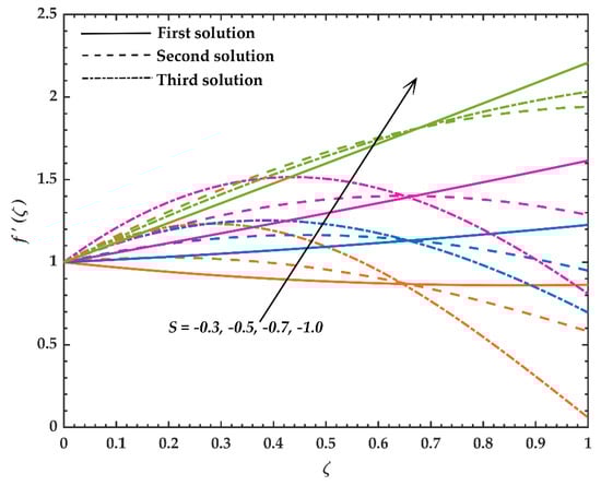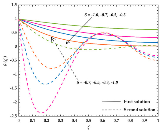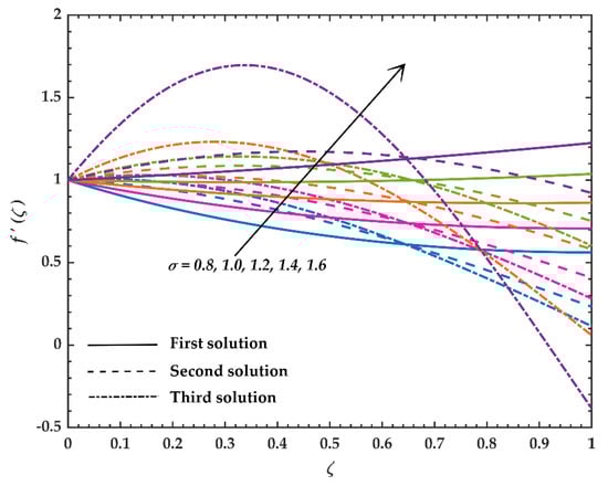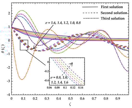 Figure 2 demonstrates the velocity profiles of the Carreau fluid when varies past a stretching surface under the influence of injection at the rate of . The first and second solutions express an increment in the fluid velocity when the value of increases from 0.8 to 1.6. Vajravelu et al. [54] have reported the unique solution with the similar result trend. Based on Table 3, the increment in gradually reduces the film thickness of the first solution. The decrement in the film thickness at the free surface increases the fluid velocity past the permeable stretching sheet, which then enhances the wall shear stress along with the stretching sheet. Consequently, the value of the reduced skin friction coefficient in Table 4, increases and higher values of implies the growth in the frictional drag exerted on the stretching surface, which is not favorable in sustaining the laminar boundary layer flow. Intriguingly, the second solution in Table 3 which revealed the increment in the film thickness also records the increment in the values of like the first solution. Based on the values of for the first and second solutions in Table 4, a decrement in elucidates that the stretching sheet found to exert the drag force on the Carreau fluid by expressing the negative values of Next, Figure 3 displays the temperature profiles, and based on the first and second solutions, when the value of increases, the fluid temperature increases and the heat flux from the surface of the sheet rises. Eventually, the thermal conductivity past the stretching sheet depreciates and increases the value of the local Nusselt number.