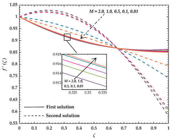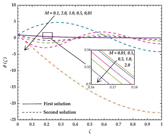 Table 5 overviews the effect of the thermocapillarity number over and The first solution in Table 5 exhibits the gradual increment in the film thickness when the values of M increases from 0.01 to 2.0. The increment in the film thickness then affects the fluid velocity to decrease, and this is depicted in Figure 4. The decreasing fluid velocity then reduces the wall shear stress past the stretching sheet and results in the decrement of as shown in Table 6. Noor and Hashim [39], and Rehman et al. [44] also have reported the decrement of the skin friction coefficient in their work. On the other hand, the second solution indicates the decrement in the value of past the unsteady stretching sheet. No one has reported such a trend before, and this suggests that an increment in the surface tension gradient have the potential to enhance the film thickness. The gradual increment in the film thickness triggers the speed of the fluid flow to increase, which then increases the wall shear stress and eventually, the value of increases. Besides that, the first solution in Figure 5 illustrates the decreasing trend of the fluid temperature when the thermocapillarity effect dominates near the free surface. When the fluid temperature decreases, the heat flow rate intensity from the surface of the stretching sheet declines. Thus, the thermal conductivity over the stretching surface increases and inducing the rate of heat transfer to decrease when M increases (see Table 6). These trends are in accordance with the findings given by [44]. The negative values of elucidate that the heat energy is transferred from the fluid to the stretching sheet. Conversely, the second solution shows the decrement in and the fluid temperature at the free surface found be increasing when increases after encountering some mild fluctuations across the boundary layer. As a result, the rate of convection heat transfer becomes inconsistent with the trend of increasing, decreasing, and increasing.