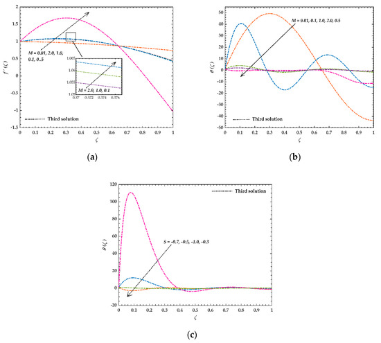 (a) Velocity profiles, of the third solution when and as varies; (b) Temperature profiles, of the third solution when and as varies; (c) Temperature profiles, of the third solution when and as varies.